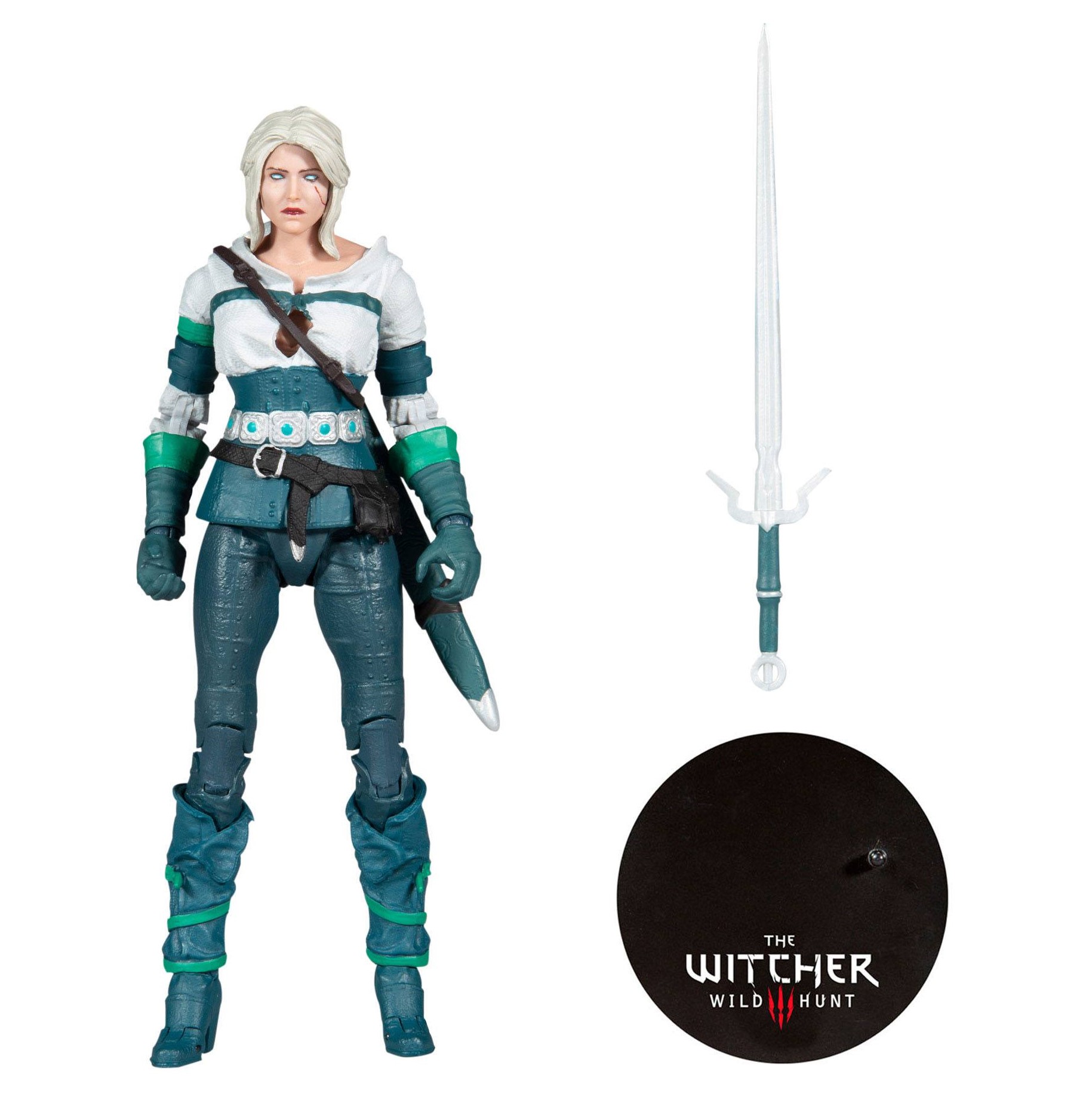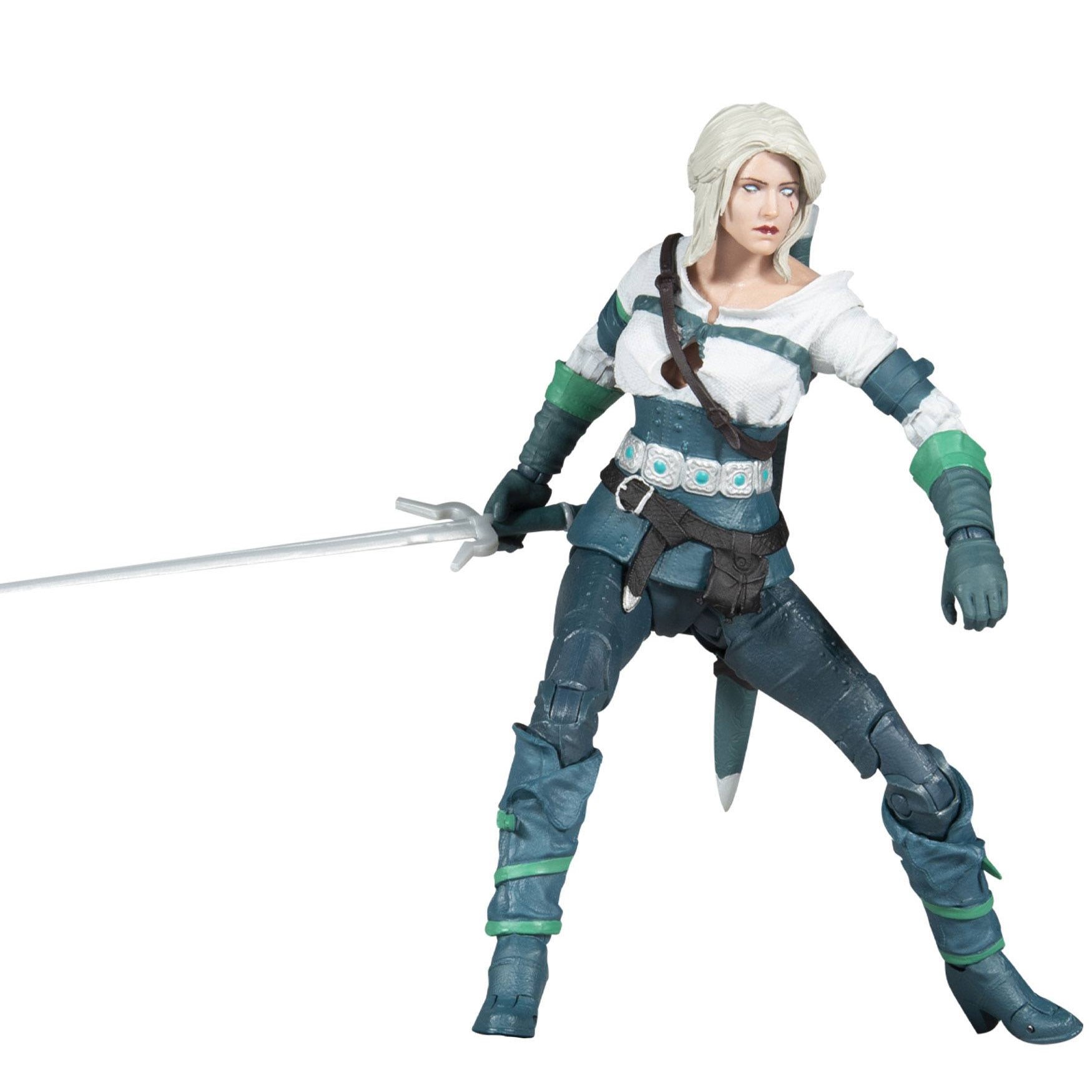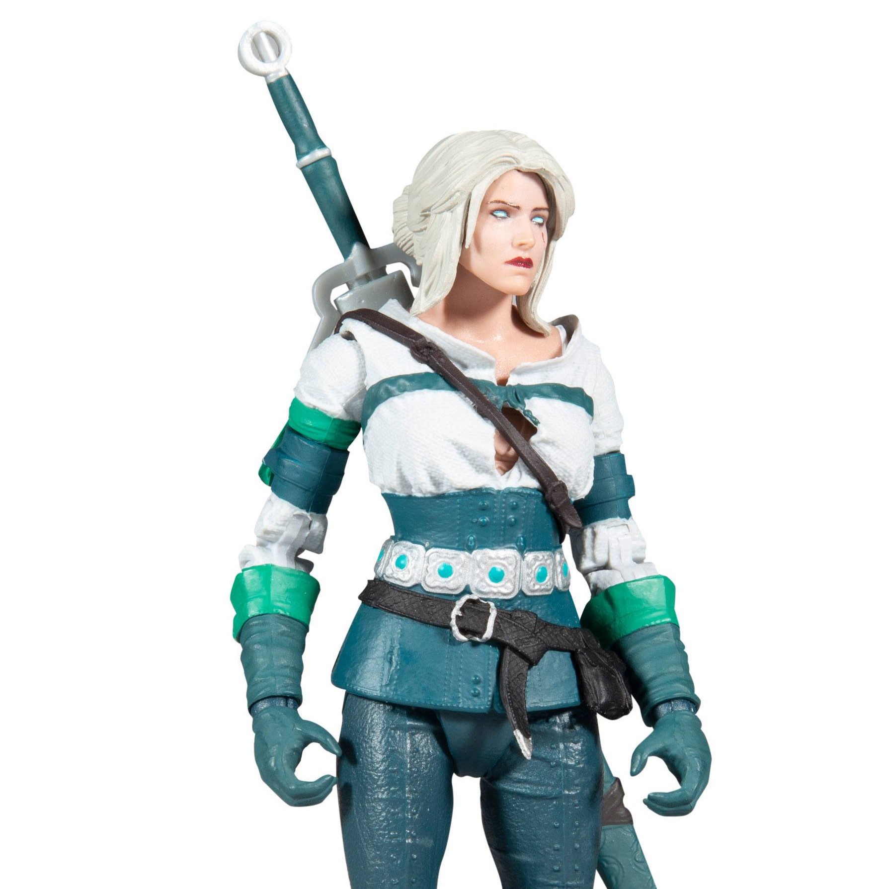 Mc Farlane a baptisé cette figurine articulée : Ciri elder blood. Et elle présente en effet la jolie princesse, sous la protection de Geralt of Rivia, en train de faire usage de ses pouvoirs et dons magiques. Car l’héritière du sang des anciens a les yeux blancs/bleus. Enfin, cette réplique de Cirilla Fiona Elen Riannon est livrée avec son épée et son fourreau.