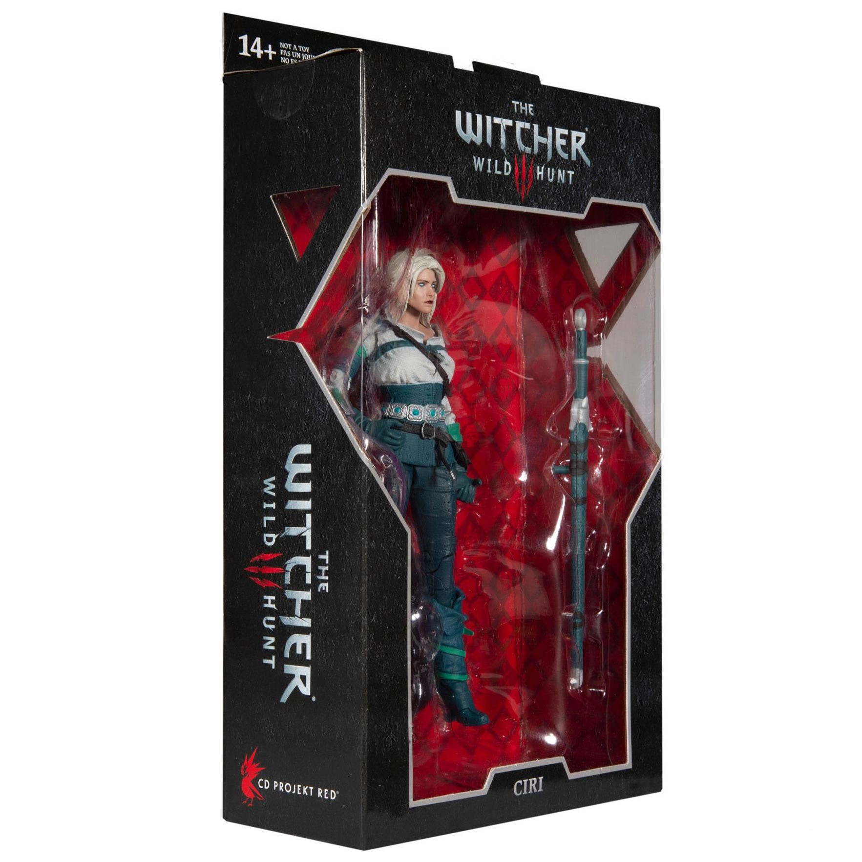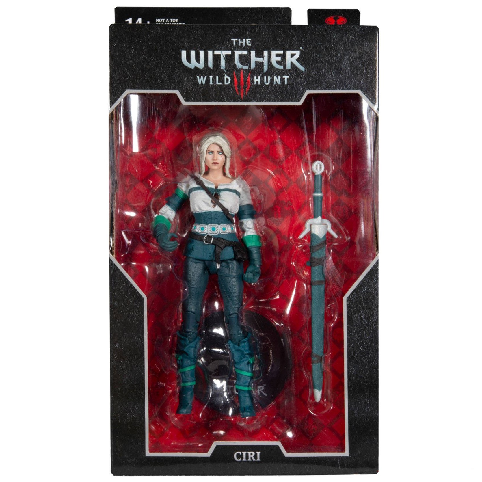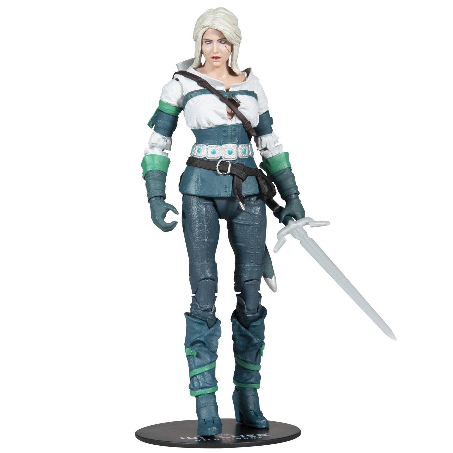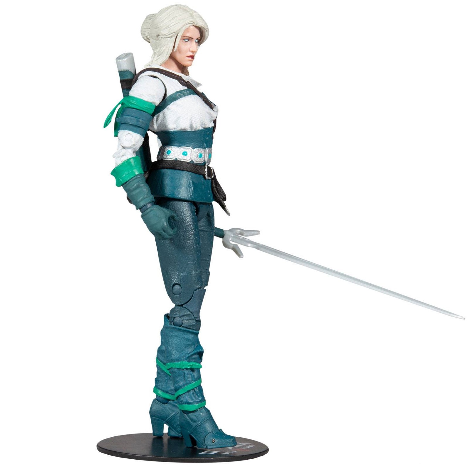 Mc Farlane a baptisé cette figurine articulée : Ciri elder blood. Et elle présente en effet la jolie princesse, sous la protection de Geralt of Rivia, en train de faire usage de ses pouvoirs et dons magiques. Car l’héritière du sang des anciens a les yeux blancs/bleus. Enfin, cette réplique de Cirilla Fiona Elen Riannon est livrée avec son épée et son fourreau.
