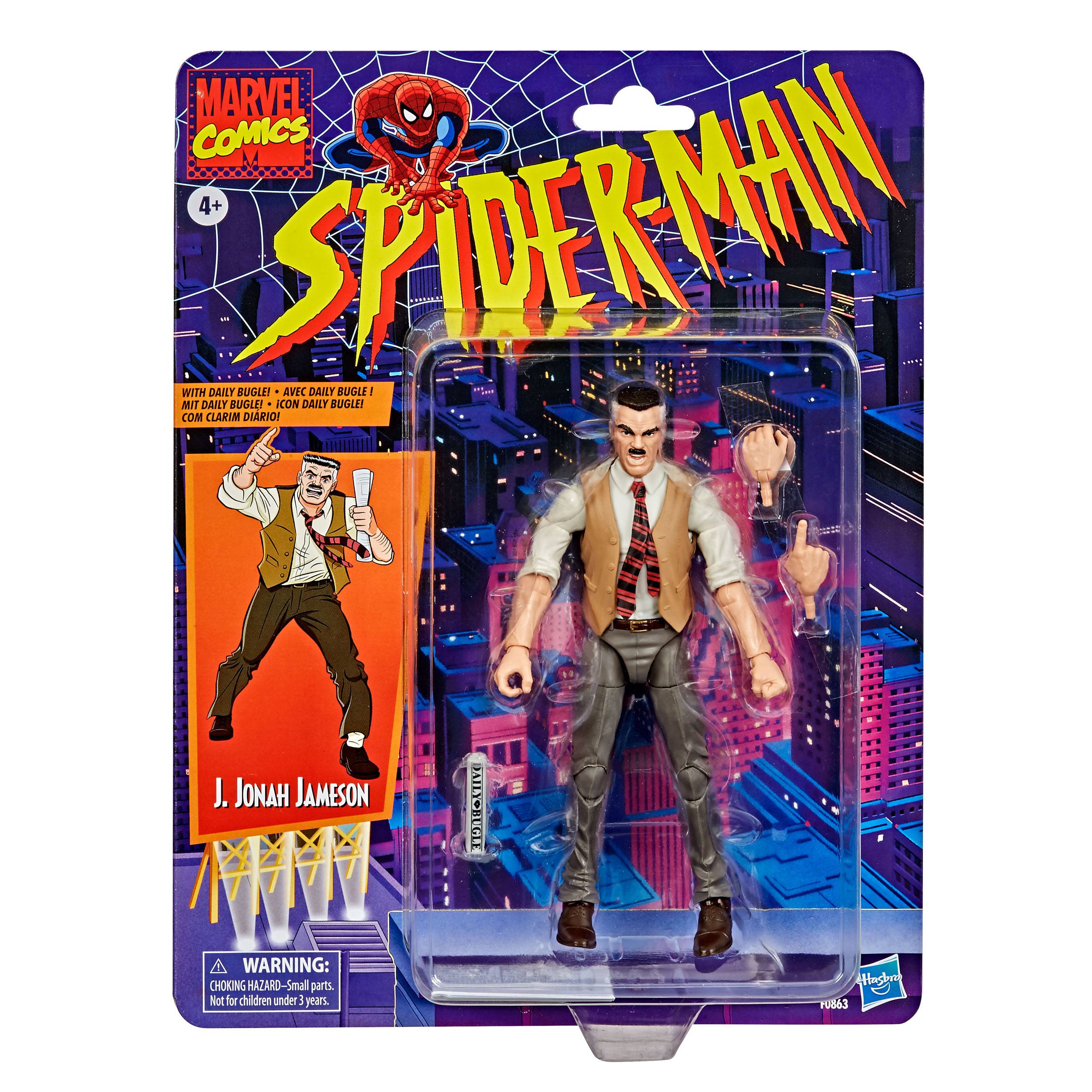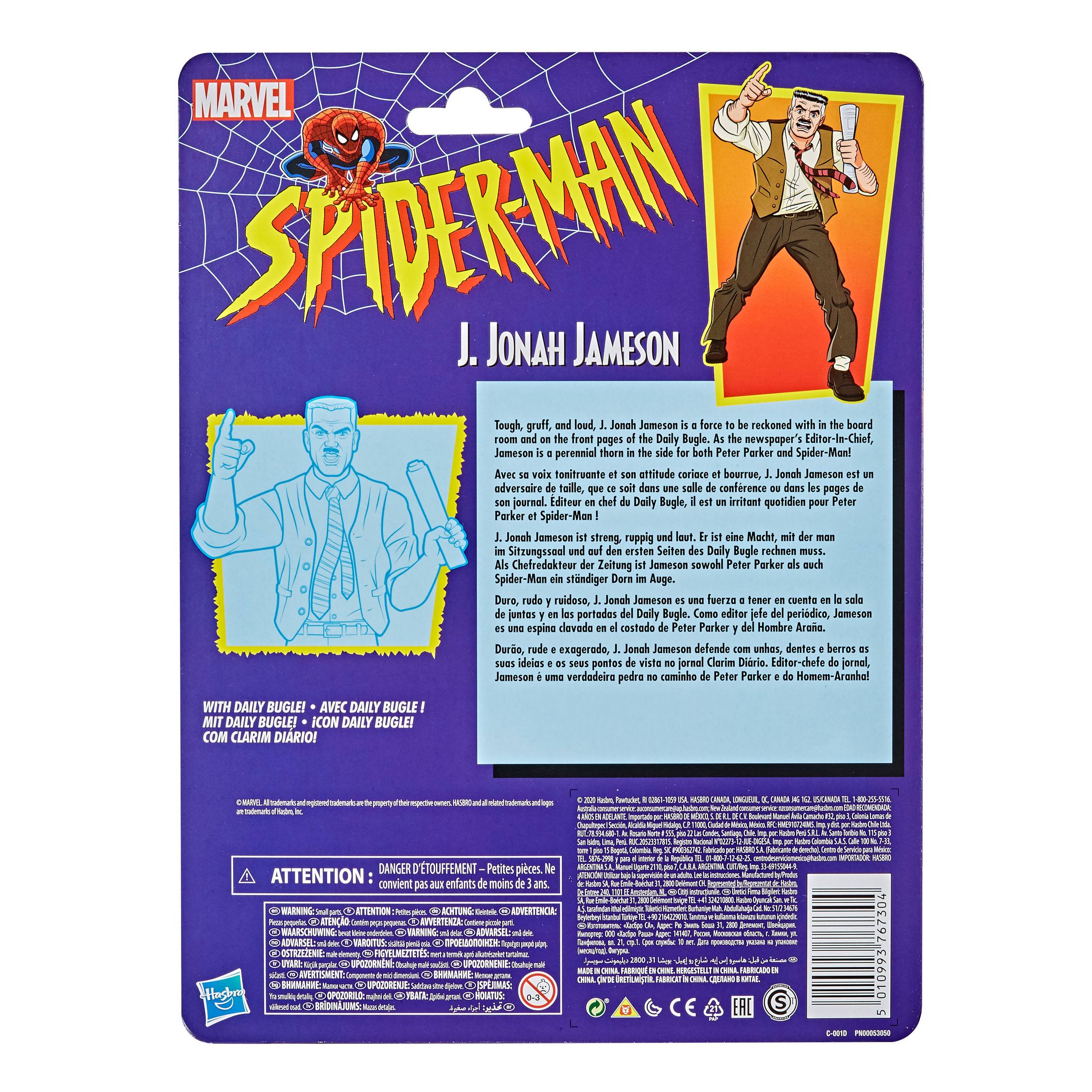 Voici une figurine de la rétro collection Hasbro de J. Jonah Jameson. Il s’agit en effet du journaliste célèbre dans Spider-Man. Il travaille pour le Daily Bugle, qu’il tient d’ailleurs sous le bras. Avec, entre autres, un article à la Une intitulé « Spider-Sham ». Fumeur de cigares invétéré, J. Jonah Jameson emploi Peter Parker, mais il ne cesse d’écrire des articles contre les super-héros qui seraient, selon lui, des usurpateurs.