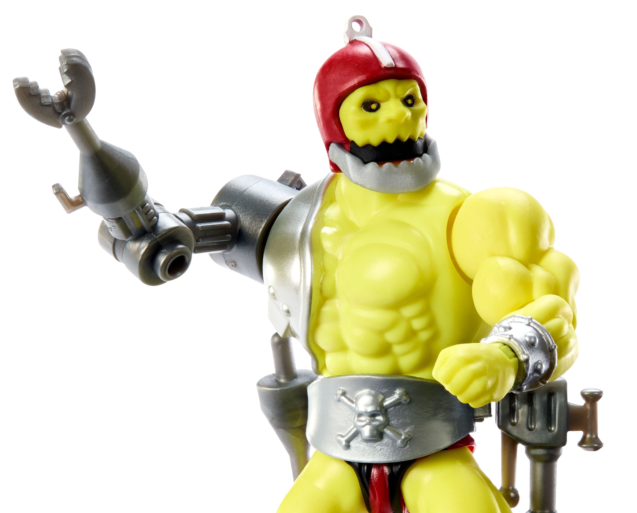 Avec sa mâchoire mécanique et son bras articulé, voici une figurine de Trap Jaw, alias Dentor. Personnage des Maîtres de l’univers, c’est un allié de Skeletor. Une brute qui peut utiliser diverses armes et qui est redoutable. La figurine, bien articulée, permet de lui donner plusieurs postures et attitudes et de recréer bien des scènes de MOTU.